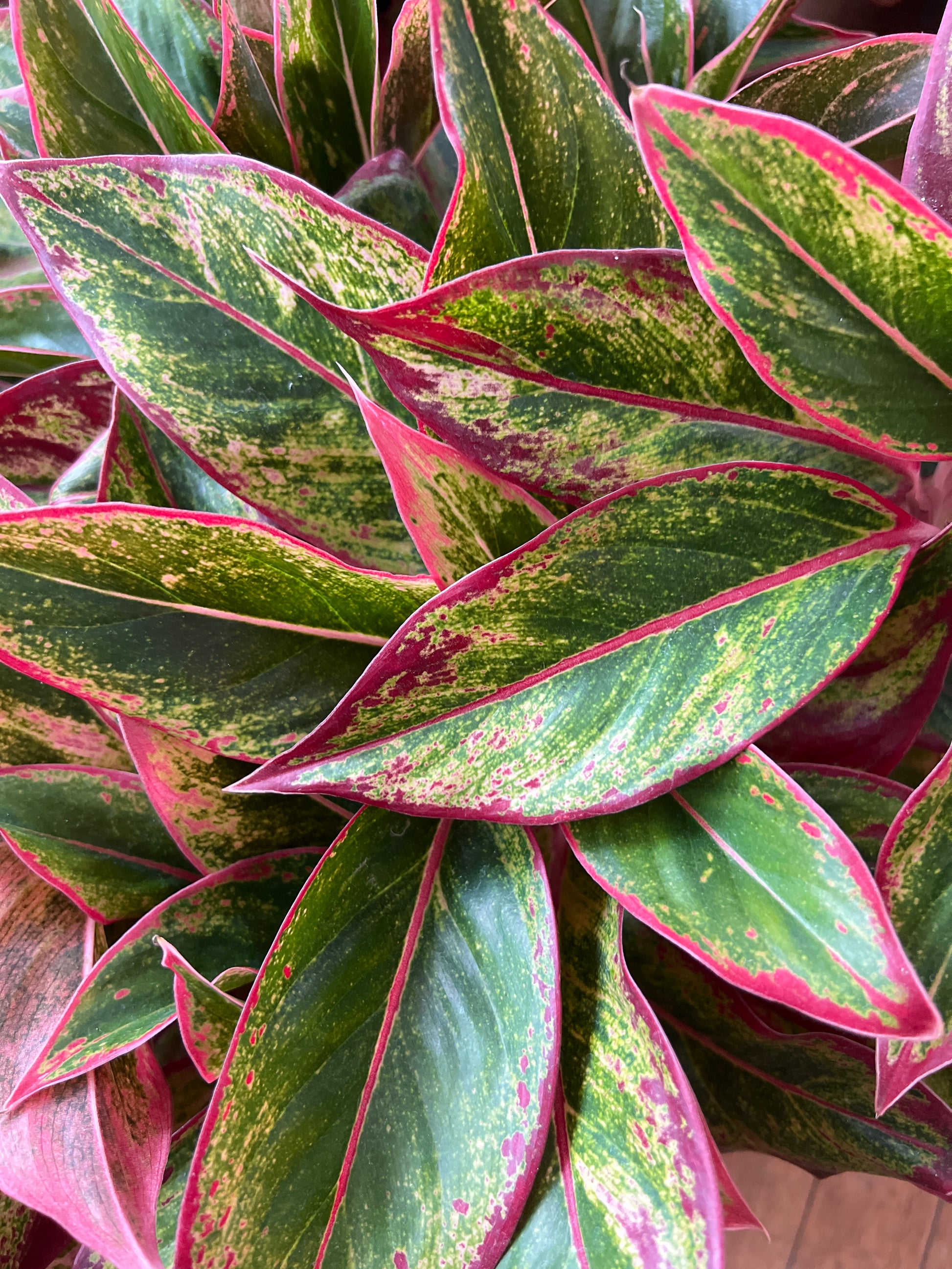 Aglaonema 'Aurora' is a striking tropical foliage plant known for its vibrant red and pink margins that contrast against deep green leaves. The colorful variegation and glossy leaf texture make it a standout choice for indoor décor. It grows in a compact, clumping form and is appreciated for its low maintenance and air-purifying qualities.