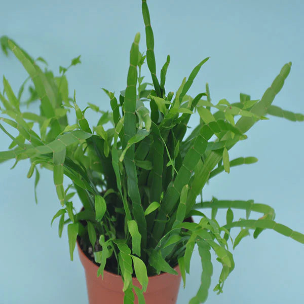 True leaves are small and short-lived, appearing briefly at stem nodes before dropping. The flattened, ribbon-like stems perform photosynthesis and function as the primary visual element. These glossy green stems twist and branch irregularly, giving the plant its signature curled appearance.