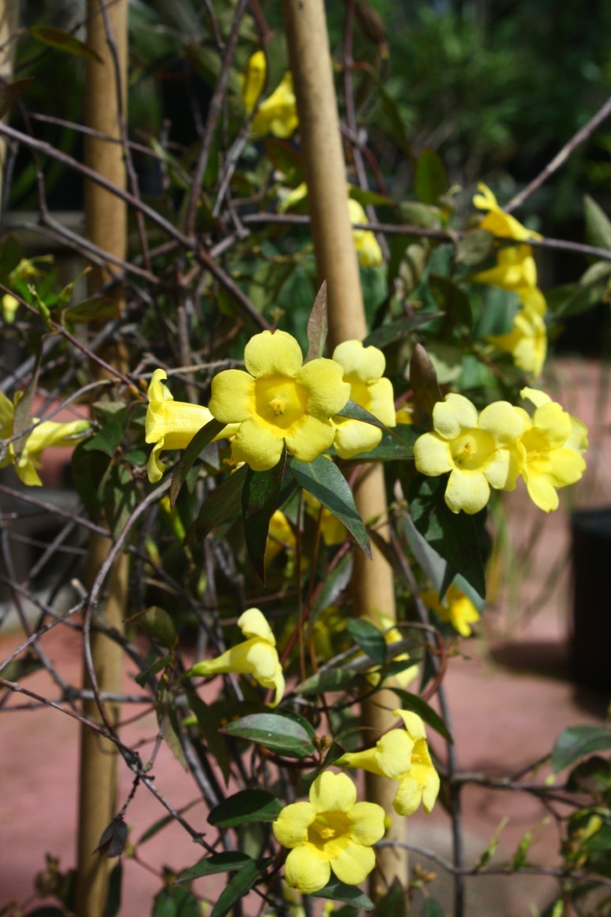 Trumpet-shaped flowers emerge in late winter through early spring, forming clusters of clear golden-yellow blooms along the stems. Each blossom carries a soft fragrance that intensifies during warm afternoons. The vivid color stands out against evergreen foliage and provides early nectar resources for pollinators. Flowering is most abundant on established plants that receive ample light and proper pruning.